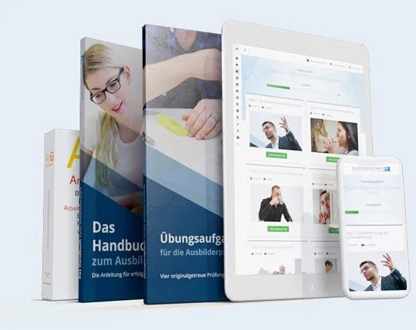 Du erhältst in deinem Ausbilderkurs neben dem Kurszugang auch ein Handbuch, ein Übungsheft und das aktuelle ArbG per Post. So kannst du dich ohne „Schulbankdrücken“ entspannt auf deinen Ausbilderschein vorbereiten.
