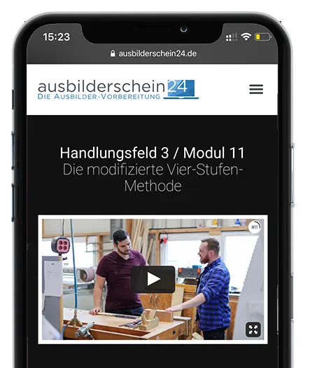 Für die schriftliche Prüfung erhältst du in unserem Ausbilderkurs mehr als 400 originalgetreue Prüfungsfragen und die Möglichkeit, dein Wissen in einer Prüfungssimulation unter fast realen Prüfungsbedingungen zu testen. Die praktische Prüfung ist einer der wichtigsten Themenbereiche in unserem Ausbilderkurs. Wir setzen uns intensiv mit deinem individuellen Ausbildungskonzept auseinander, geben dir Tipps für die Themenwahl und bereiten dich ganz gezielt auf deine praktische Prüfung vor. Dazu gehören auch reale Beispiele für eine Ausbildungseinheit oder mehr als 100 mögliche Fragen im Fachgespräch.