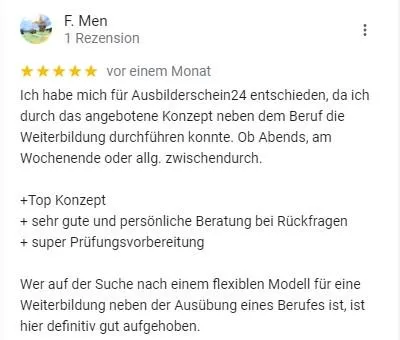 * 100% Geld-zurück-Garantie: Falls du deine Ausbilderprüfung auch nach der 2. Wiederholungsprüfung nicht bestehen solltest, erstatten wir dir die Kursgebühr.